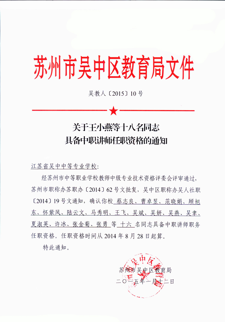 关于蔡志良等十六名同志具备中职讲师职务任职资格的通知
