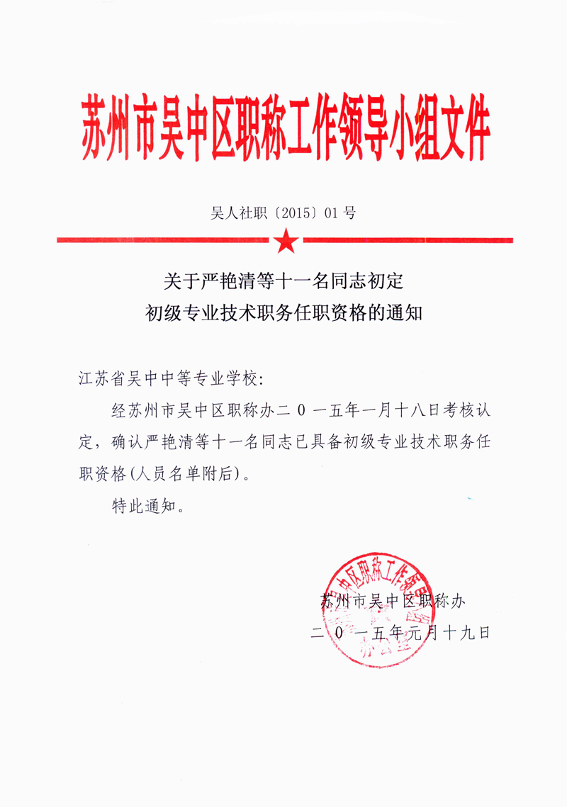 关于严艳清等十一名同志初定初级专业技术职务任职资格的通知