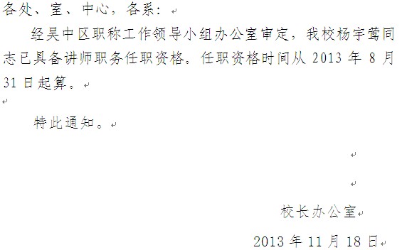关于杨宇莺同志具备讲师职务任职资格的通知