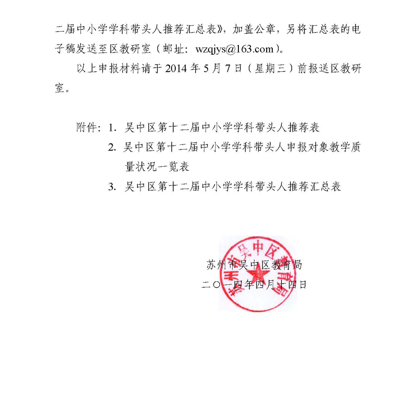 关于第十二届中小学学科带头人推荐评选工作的通知 来源:本站原创 发布时间:2014-04-16 09:09:27 浏览次数: 次 【字体:小 大】 附件1-2:推荐表、教学质量表 分享到: 【打印正文】 相关内容