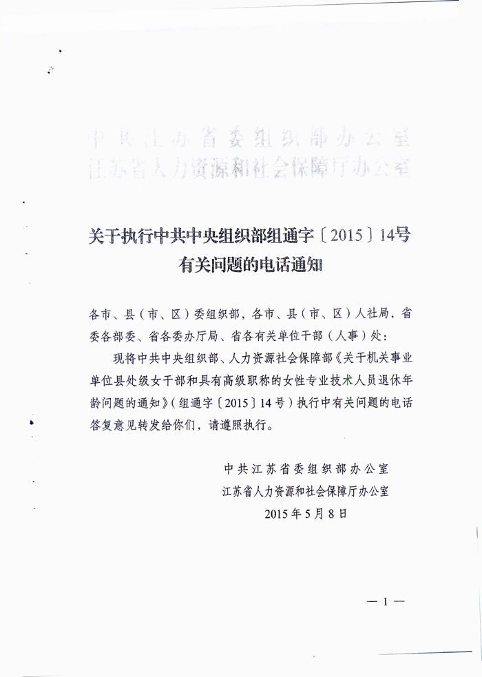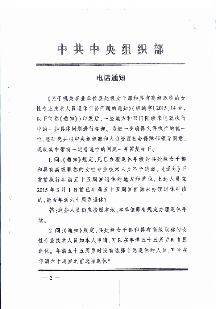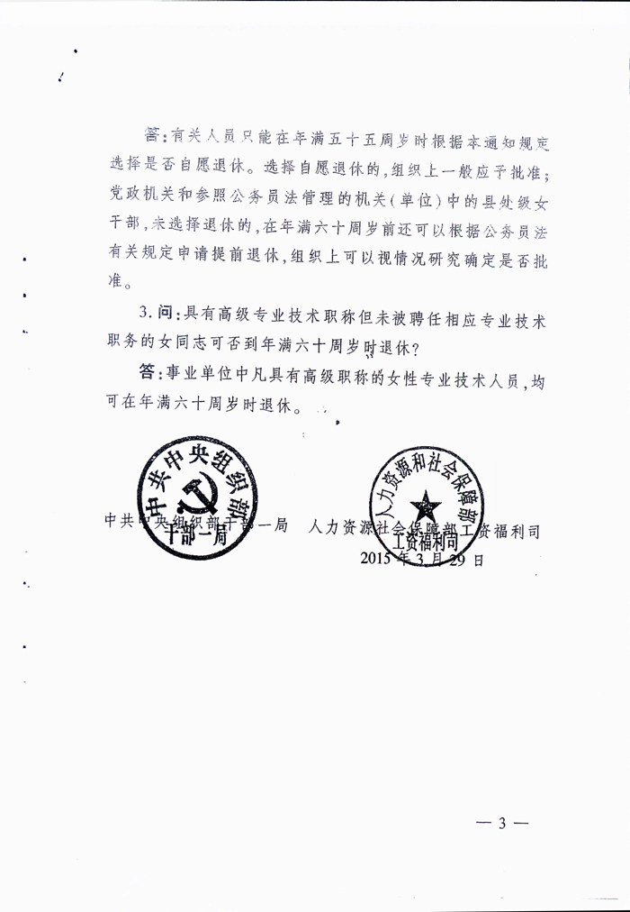 关于机关事业单位县处级女干部和具有高级职称的女性专业技术人员退休年龄问题的通知中有关问题中组部答复 来源:本站原创 发布时间:2015-05-21 13:43:44 浏览次数: 次 【字体:小 大】 分享到: 【打印正文】 相关内容