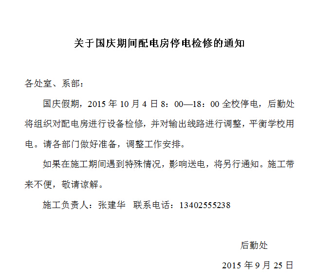 关于国庆期间配电房停电检修的通知