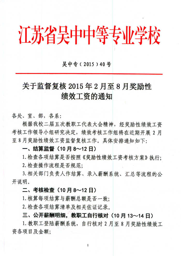 关于监督复核2015年2月至8月奖励性绩效工资的通知