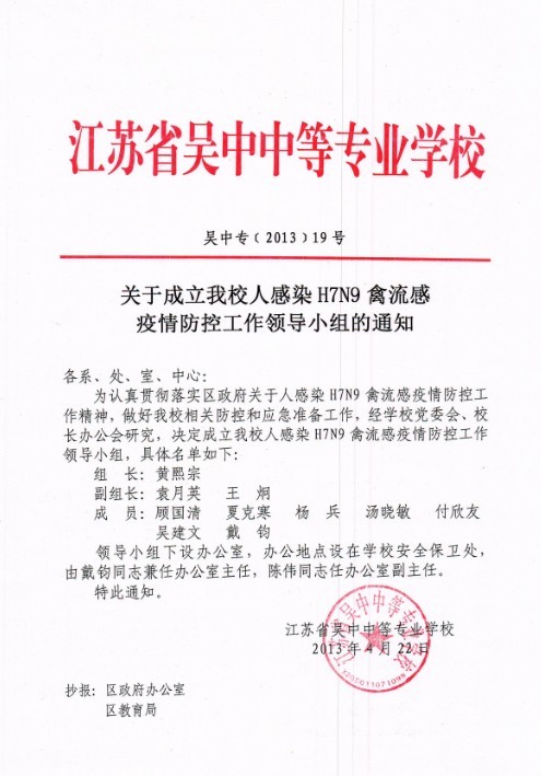 关于成立我校人感染H7N9禽流感疫情防控工作领导小组的通知