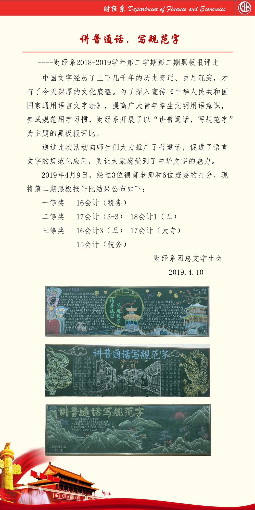 讲普通话,写规范字----财经系2018-2019学年第二学期第二期黑板报评比 来源:本站原创 发布时间:2019-04-12 15:07:04 浏览次数: 次 【字体:小 大】 分享到: 【打印正文】 相关内容