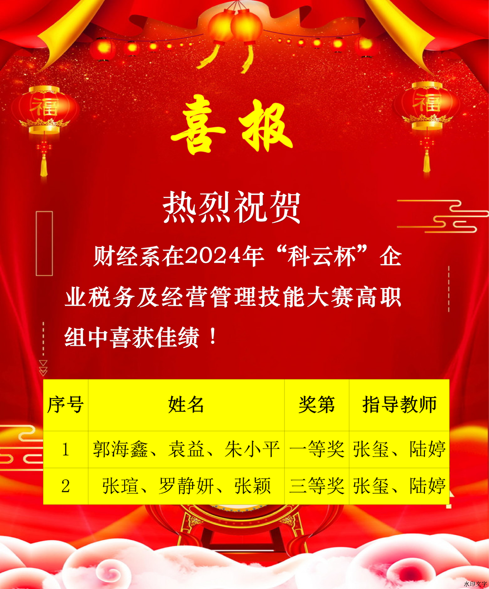 喜报——财经系在2024年“科云杯”技能大赛中喜获佳绩 ! 来源:财经系 发布时间:2024-05-28 15:15:12 浏览次数: 次 【字体:小 大】 发布:葛燕秋审核:俞喜琴 终审:财经系 分享到: 【打印正文】