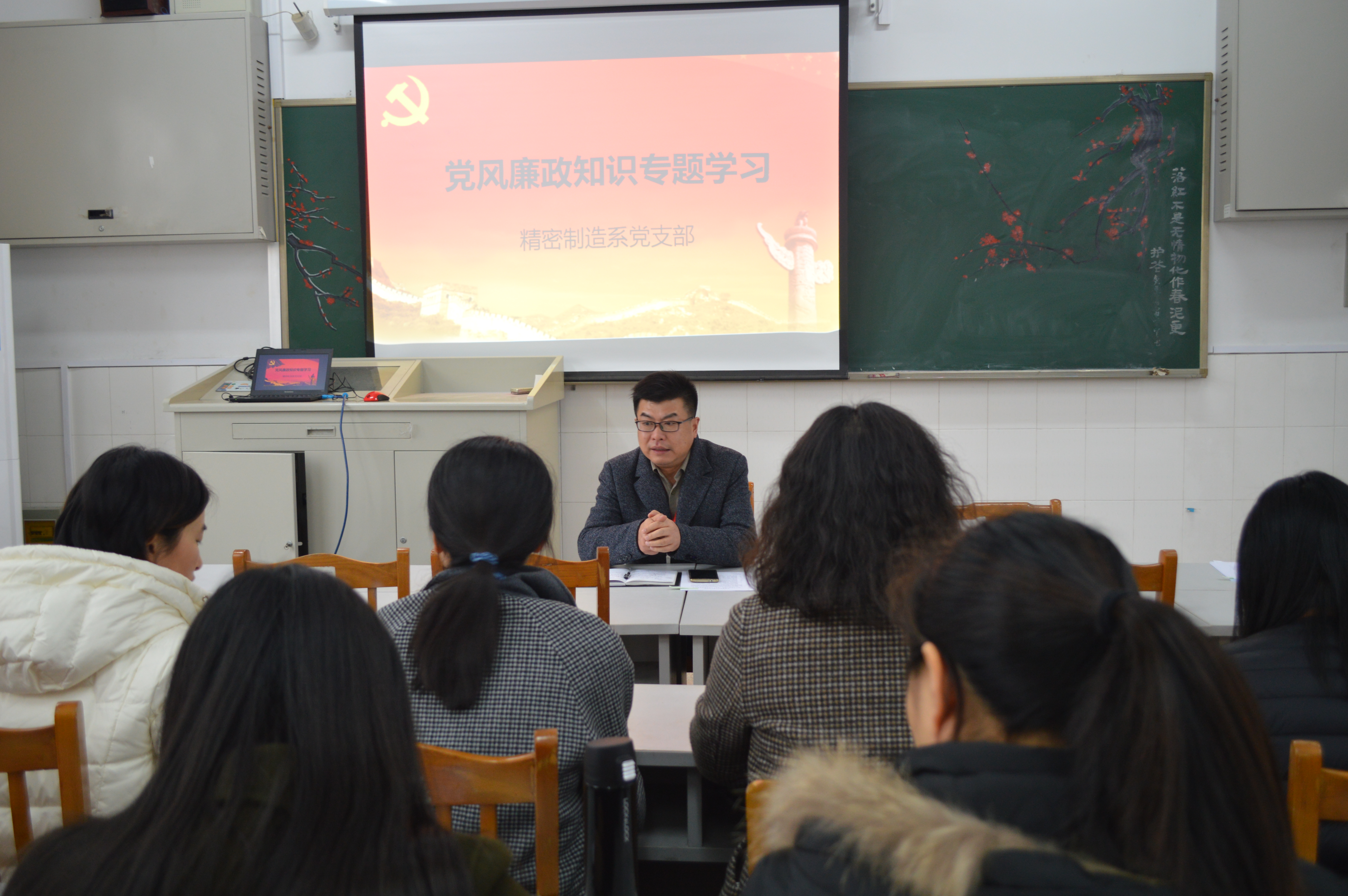 为准确把握、认真贯彻十九大会议精神,进一步强化学校支部党内监督,加强党风廉政建设,2018年12月19日下午16:00,精密制造系党支部在A3-206党员活动室召开了党风廉政建设专题学习会,会议由系党支部书记张思明主持。