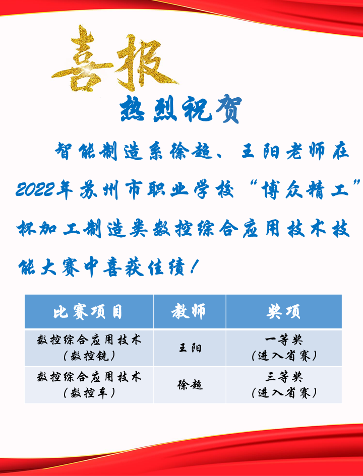 喜报——热烈祝贺智能制造系徐超、王阳老师在2022年苏州市职业学校“博众精工”杯加工制造类数控综合应用技术技能大赛中喜获佳绩! 来源:智能制造系 发布时间:2021-11-22 15:08:48 浏览次数: 次 【字体:小 大】 终审:智能制造系 分享到: 【打印正文】