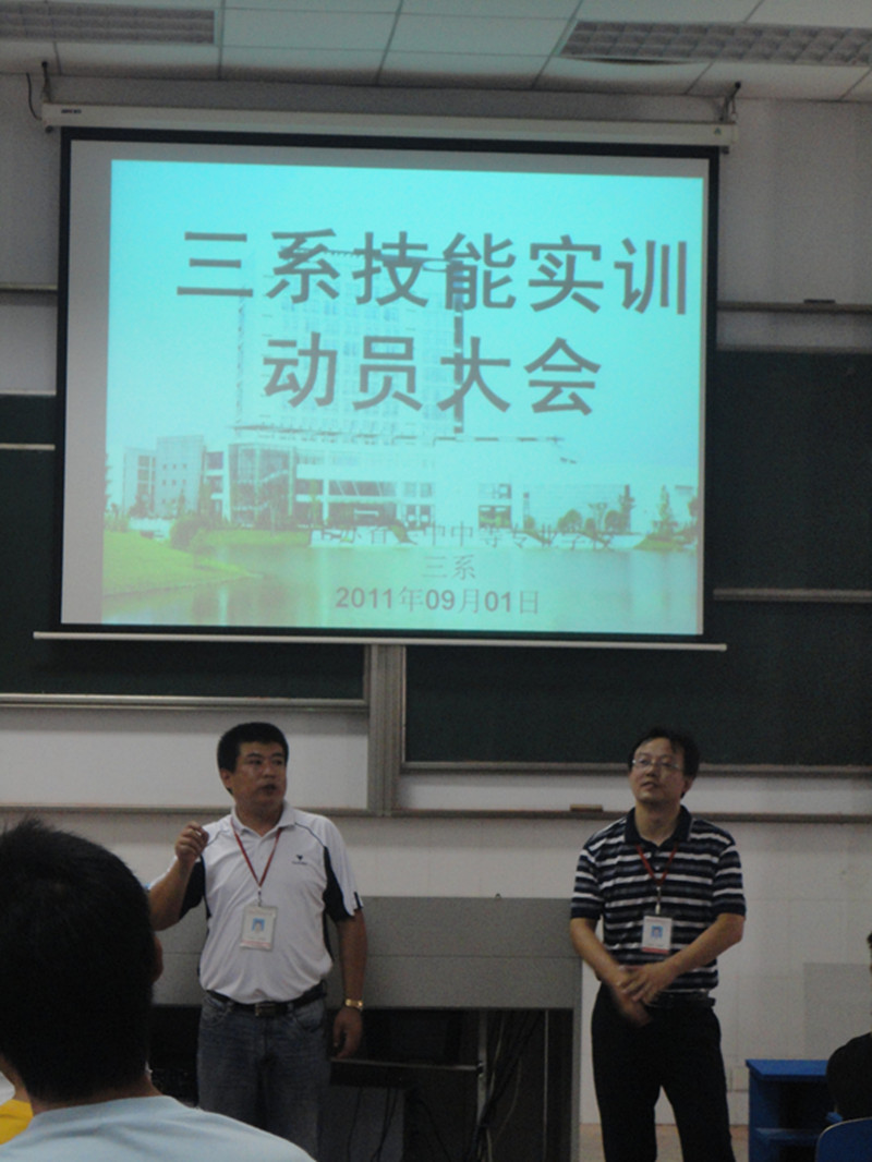 9月1日上午8点15分,我系在A6-2楼多媒体教室召开了实训动员大会,参加会议的有我系张思明主任、实训技能马明学主任和全体09数控(1)城五、10模具(1)大专、10数控(1)城五、10机电大专四个班级的同学。参加人员还有参加实训的班主任及全体实训指导老师。首先张主任作了重要讲话,让同学们把握和珍惜这次来之不易去实训中心进行实训的机会,他还强调同学们一定要注意安全,并从注意实训期间安全和在校安全作了具体要求,并嘱咐同学们在实训期的功课不能落下,应系统的复习所学课程。随后,马主任也重点强调了学生要注意自身的安全问题,并安排了实训的流程和实训项目以及本次实训的注意事项。