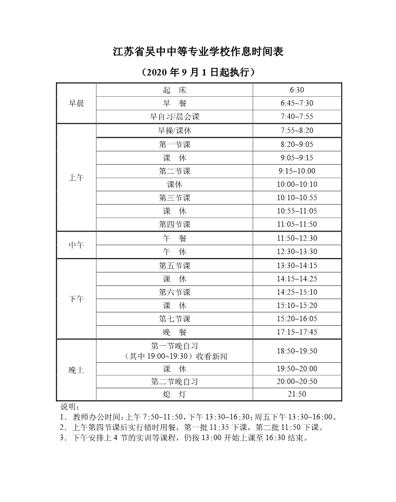 江苏省吴中中等专业学校作息时间表(2020.9.1执行)