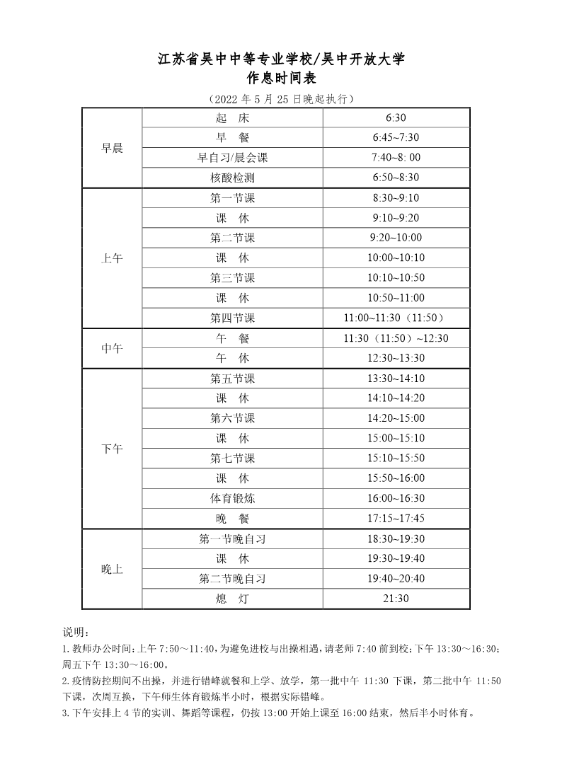2021~2022学年度第二学期作息时间表(2022年5月25日起执行) 来源: 发布时间:2022-05-25 10:57:03 浏览次数: 次 【字体:小 大】 终审:教务处 分享到: 【打印正文】