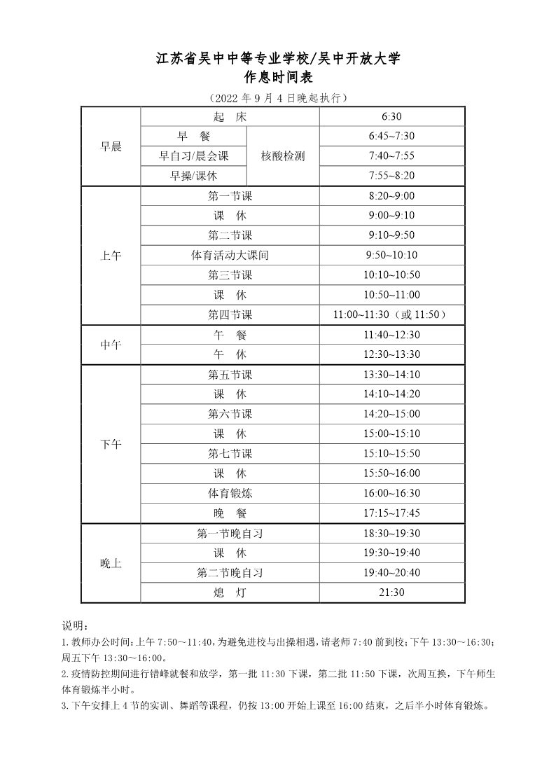 2022~2023学年度第一学期作息时间表(2022年9月4日起执行)