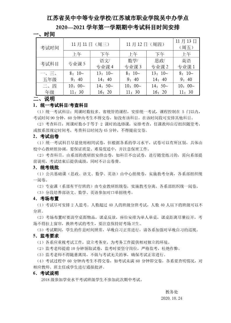 2020-2021学年第一学期期中考试安排