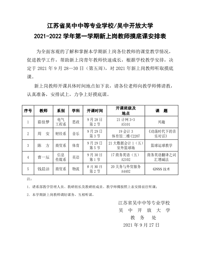 2021-2022学年第一学期新上岗教师摸底课安排