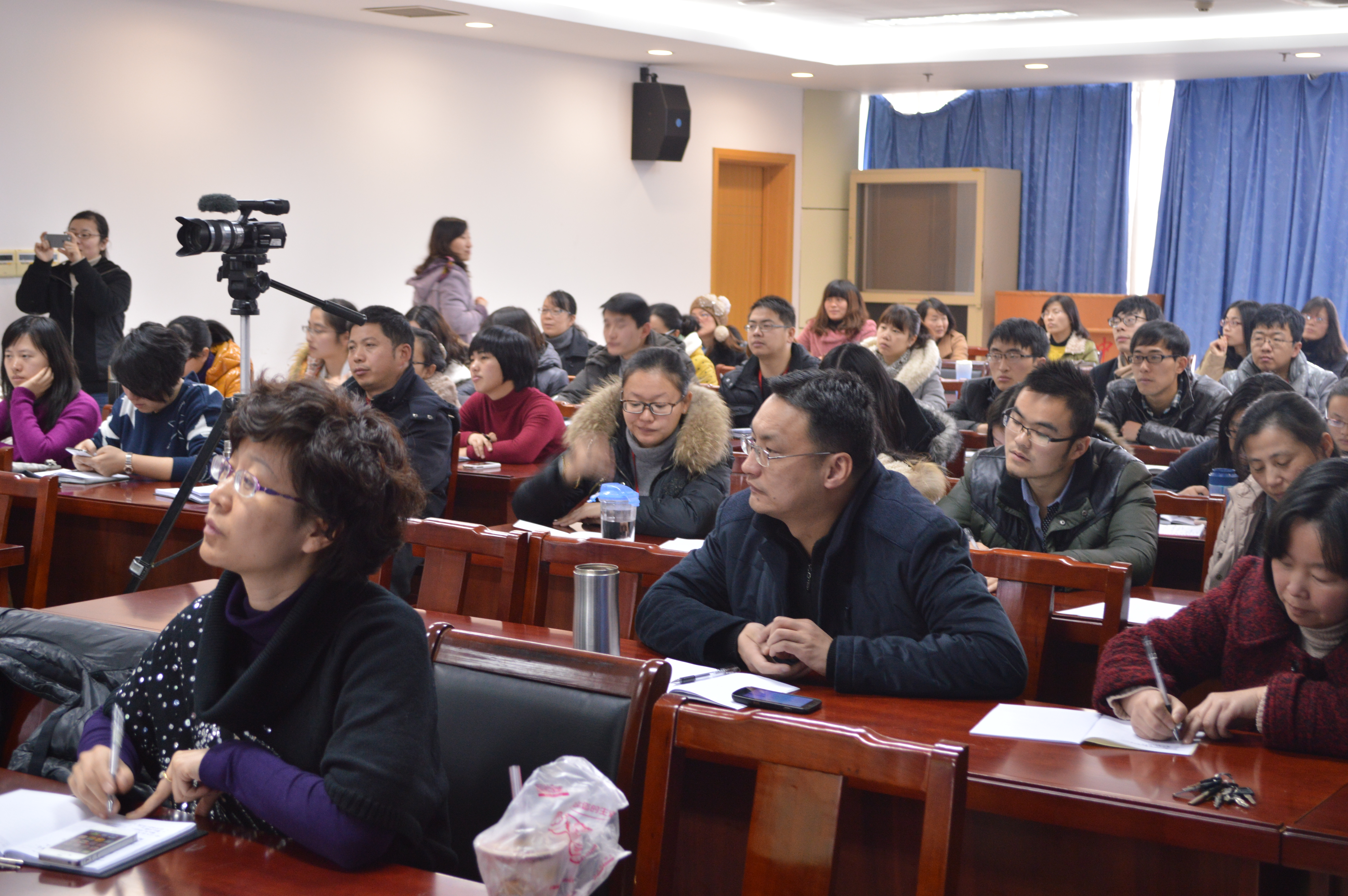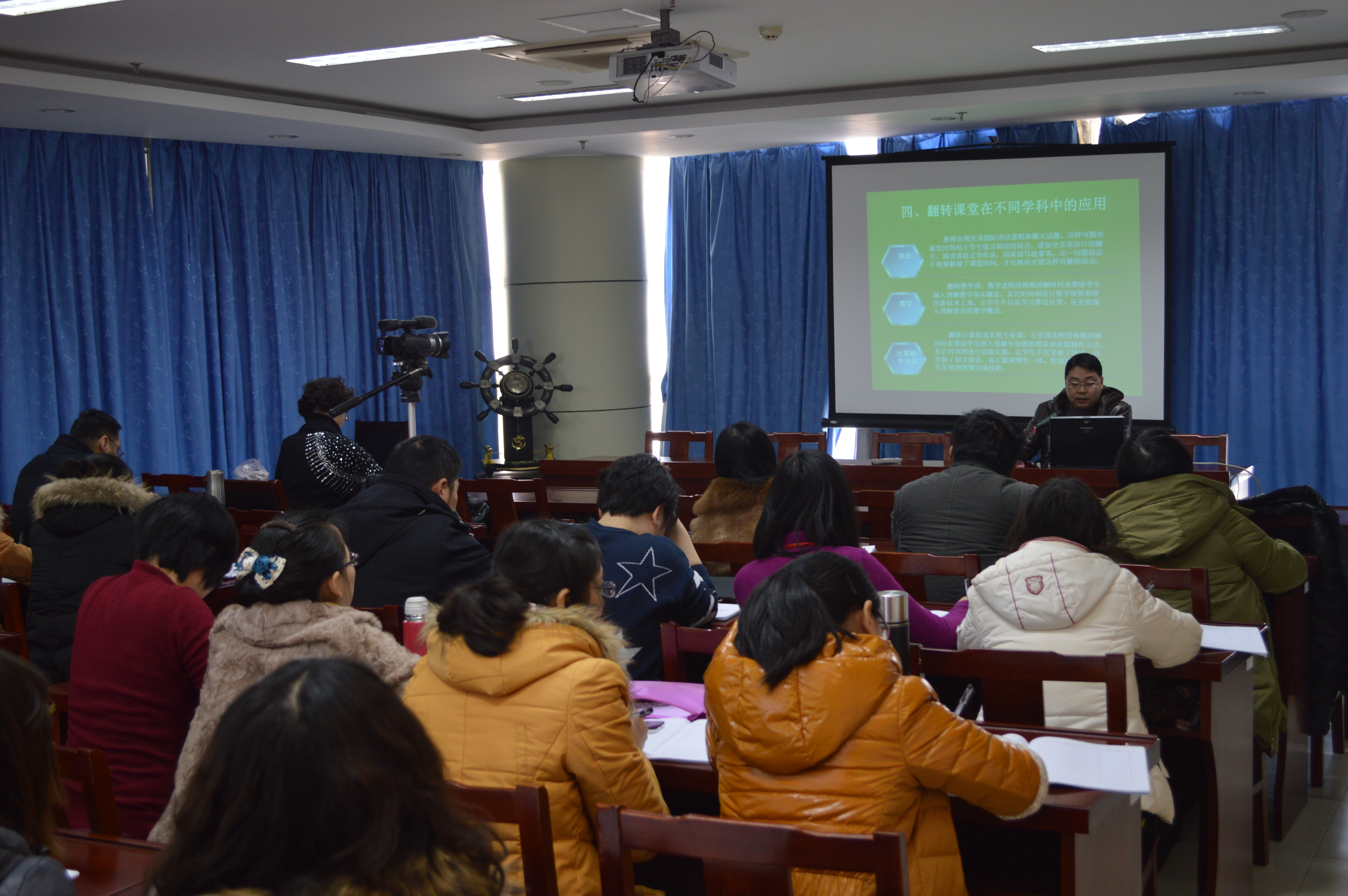 原定40多人的培训会吸引了70多位教师的参与,培训会场座无虚席,蒲忠老师用生动幽默的语言,图文并茂的形式,有针对性地从翻转课堂的概念、什么是微课、微课的特点、微课制作的基本要求、微课制作的软件等方面对微课制作进行了详细的讲解和具体的指导。