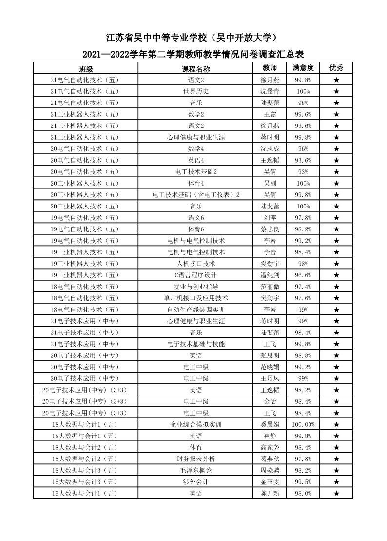 2021-2022学年第二学期教师教学情况问卷调查汇总表