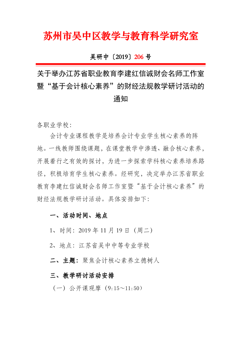 关于举办江苏省职业教育李建红信诚财会名师工作室暨“基于会计核心素养”的财经法规教学研讨活动的通知 来源:教务处 发布时间:2019-11-12 10:26:31 浏览次数: 次 【字体:小 大】 终审:教务处 分享到: 【打印正文】