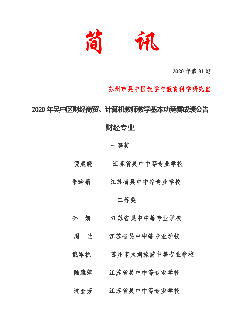 2020年吴中区财经商贸、计算机教师教学基本功竞赛成绩公告