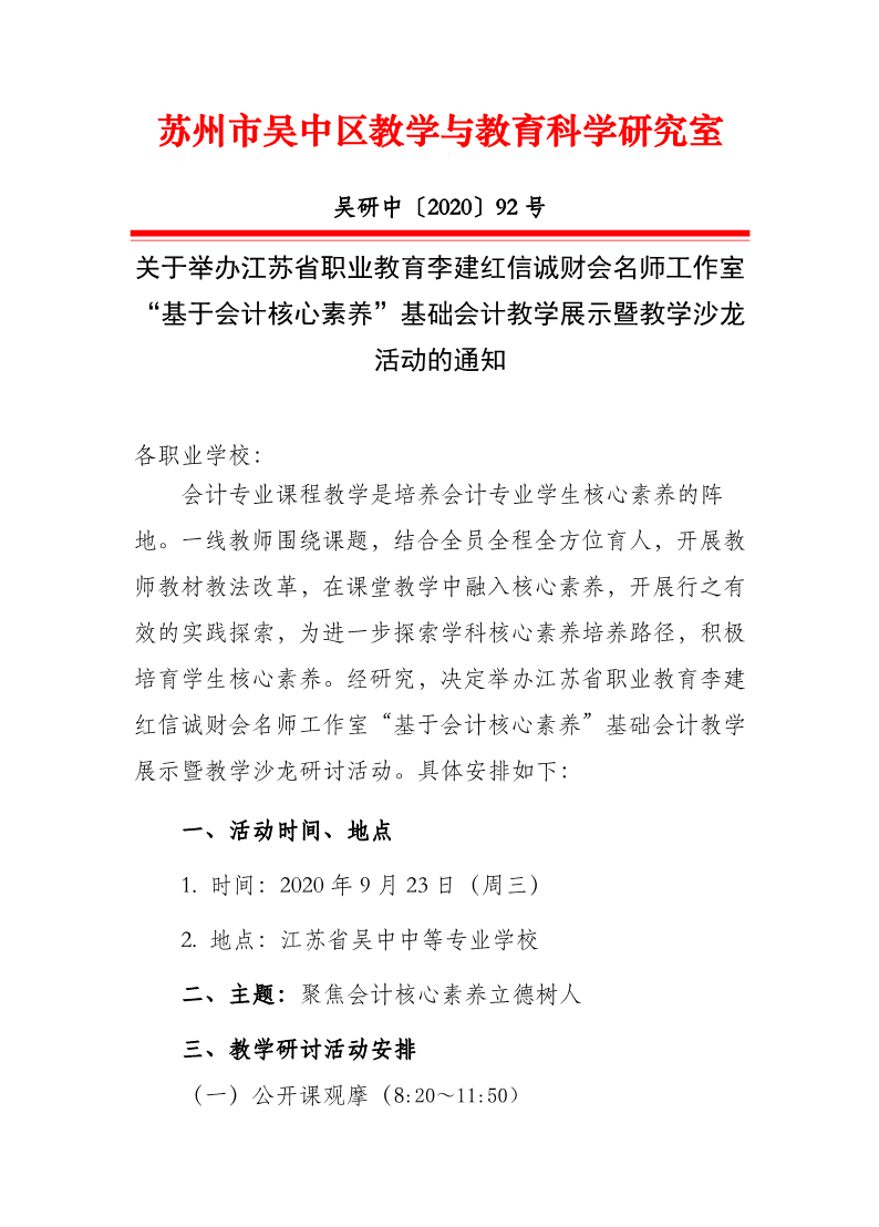 关于举办江苏省职业教育李建红信诚财会名师工作室“基于会计核心素养”基础会计教学展示暨教学沙龙活动的通知 来源:教务处 发布时间:2020-09-19 09:05:11 浏览次数: 次 【字体:小 大】 终审:教务处 分享到: 【打印正文】
