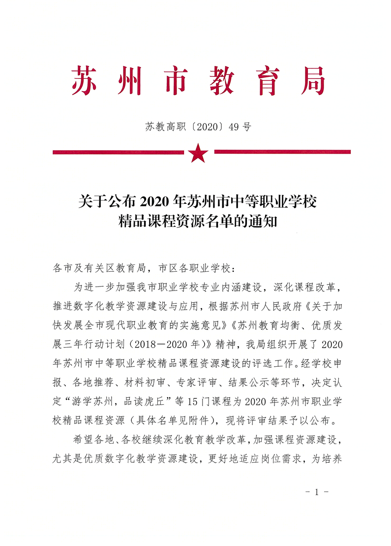 苏教高职〔2020〕49号关于公布2020年苏州市中等职业学校精品课程资源名单的通知 来源:教务处 发布时间:2020-12-21 13:45:58 浏览次数: 次 【字体:小 大】 终审:教务处 分享到: 【打印正文】