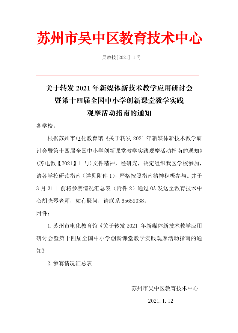 关于转发 2021 年新媒体新技术教学应用研讨会 暨第十四届全国中小学创新课堂教学实践 观摩活动指南的通知 来源:教务处 发布时间:2021-01-25 14:31:49 浏览次数: 次 【字体:小 大】 附件:关于转发2021年新媒体新技术教学应用研讨会暨第十四届全国中小学创新课堂教学实践观摩活动指南的通知.rar 终审:教务处 分享到: 【打印正文】
