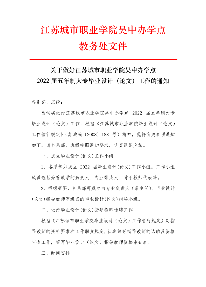 关于做好江苏城市职业学院吴中办学点2022届五年制大专毕业设计(论文)工作的通知 来源: 发布时间:2022-04-03 14:30:56 浏览次数: 次 【字体:小 大】 终审:教务处 分享到: 【打印正文】