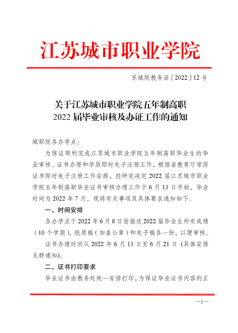 关于江苏城市职业学院五年制高职2022届毕业审核及办证工作的通知
