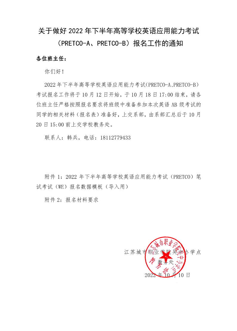 关于做好2022年下半年高等学校英语应用能力考试(AB级)报名工作的通知 来源: 发布时间:2022-10-11 09:54:52 浏览次数: 次 【字体:小 大】 附件下载:附件1:2022年下半年高等学校英语应用能力考试(PRETCO)笔试考试(WE)报名数据模板(导入用).xls 终审:教务处 分享到: 【打印正文】