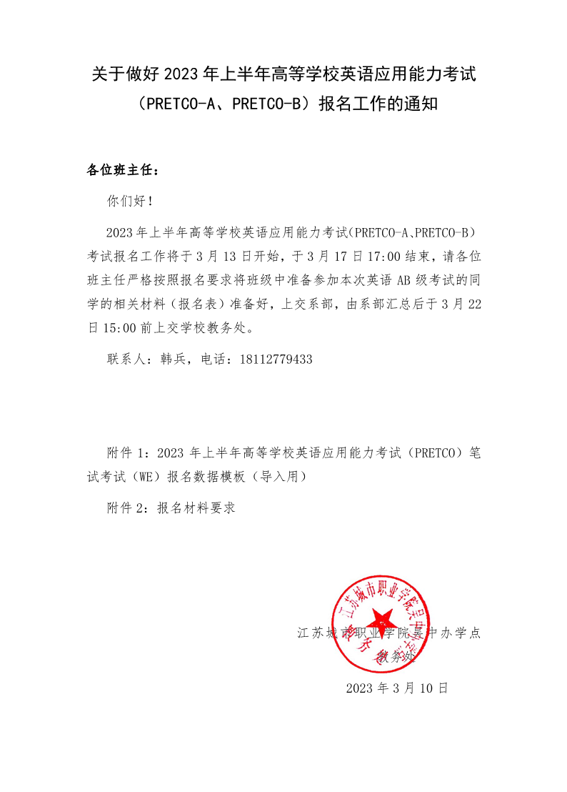 关于做好2023年上半年高等学校英语应用能力考试(AB级)报名工作的通知 来源:教务处 发布时间:2023-03-10 10:30:56 浏览次数: 次 【字体:小 大】 终审:教务处 分享到: 【打印正文】