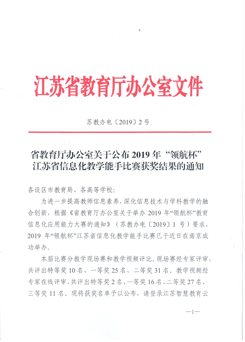 省教育厅办公室关于公布2019年“领航杯”江苏省信息化教学能手比赛获奖结果的通知-苏教办电【2019】2号 来源: 发布时间:2020-01-07 16:30:40 浏览次数: 次 【字体:小 大】 终审:宣传办 分享到: 【打印正文】