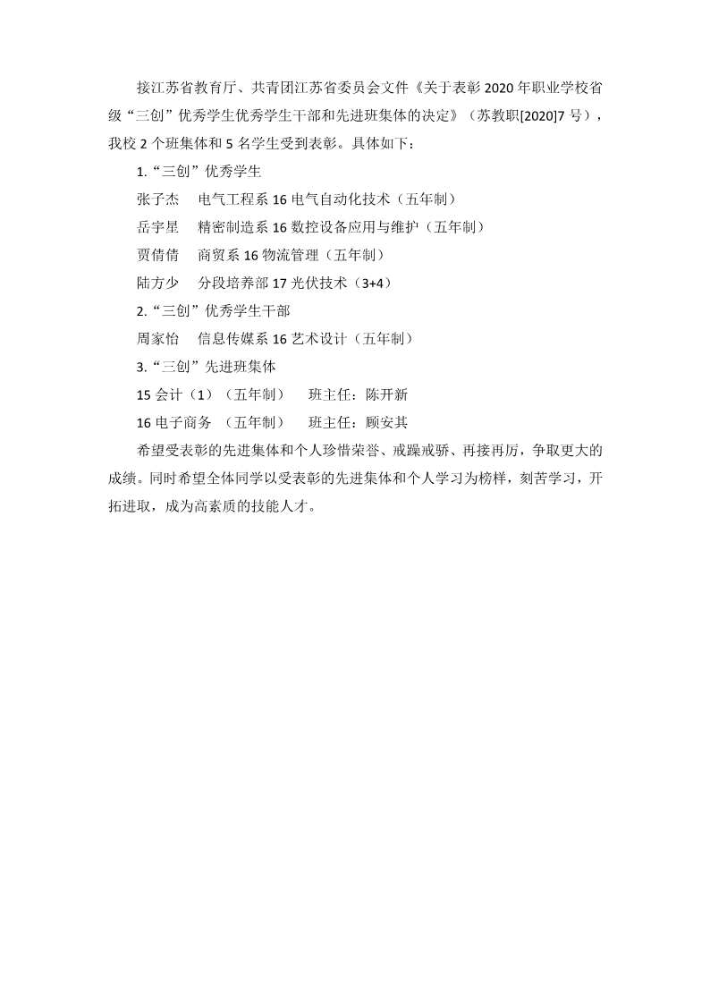 喜讯!我校在2020年职业学校省级“三创”优秀学生、优秀学生干部和先进班集体评选中获表彰 来源: 发布时间:2020-05-10 20:24:31 浏览次数: 次 【字体:小 大】 终审:宣传办 分享到: 【打印正文】