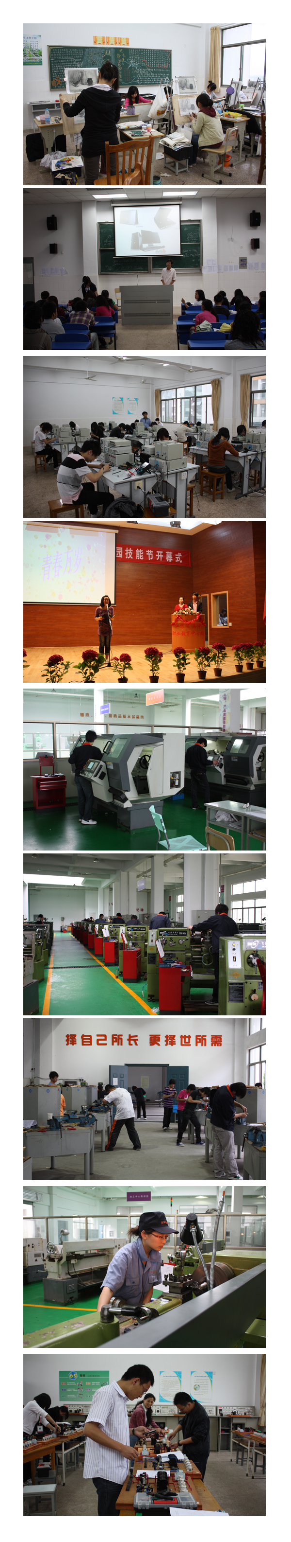 本届技能节,参与人数较多、比赛水平较高、组织比较严谨周密。赛前,各项目负责教师提前公布了竞赛方案,系部、班主任老师广泛动员,学校掀起了人人学技能、个个有比赛的技能练兵热潮,极大地推动了技能教学水平的提高,同学们积极报名,参赛师生共计近1500人次;比赛中,各项目的参赛师生都发扬了团结拼搏精神,克服困难,勇于争先,发挥了较高的水平,创造了较好的成绩。“江山代有才人出,各领风骚数百年。”赛场内激情飞扬,一幕幕你拼我赶、人人争先的场面让人感动:数控模具比赛场上,师生们挥汗如雨,一干就是3个多小时;PPT制作的赛场内,教师们聚精会神,赛场内鸦雀无声;点钞赛场上,只听得见手指点钞的沙沙声......