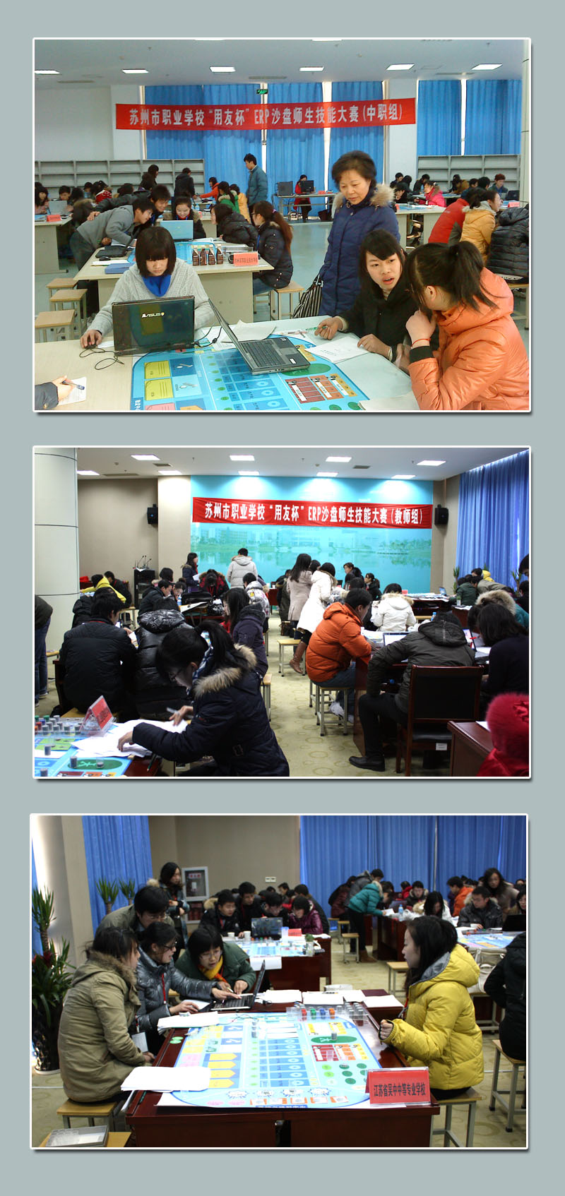1月10日, ERP沙盘师生技能大赛在我校顺利举行,这项赛事是苏州市教育局主办的2011年苏州市职业学校技能大赛的重要组成部分,来自大市20多所兄弟院校的44支参赛队参与了本次比赛,220多名师生同台竞技,参赛人数为历年之最。我校派出了李建红、钱惠琴、童艳蓉、凌俐霁、顾文瑾等15位师生组成的3支代表队参赛。