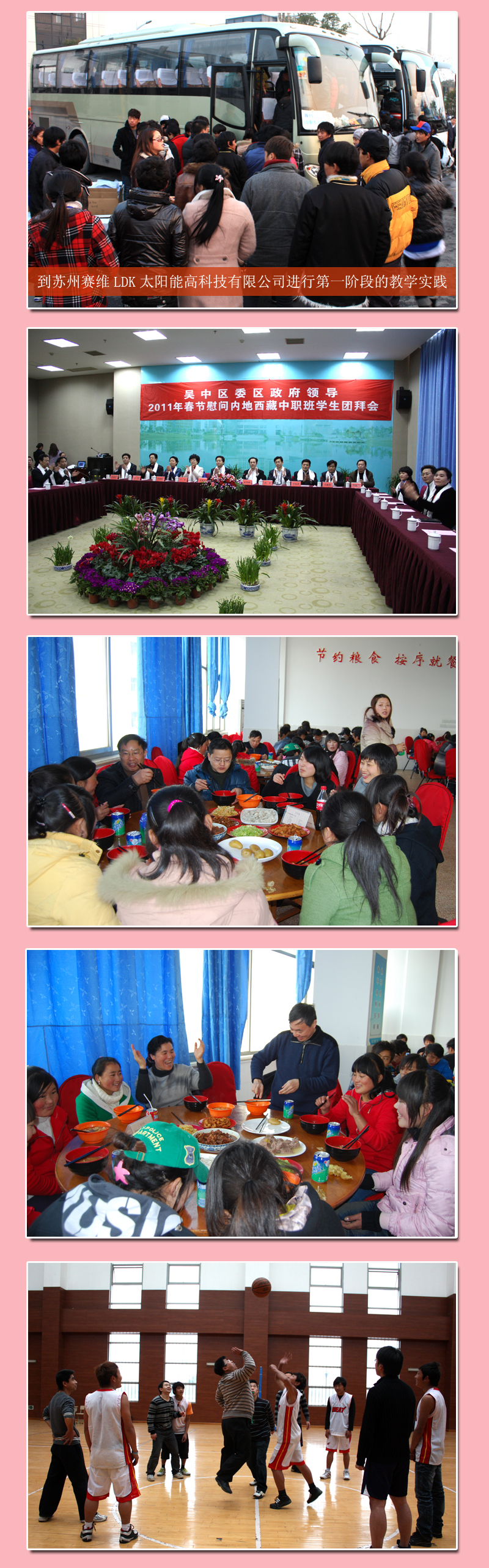 1月31日上午,在中华民族传统节日农历春节即将到来之际,苏州市政协副主席、吴中区委书记、区人大常委会主任、太湖国家旅游度假区党工委书记金海龙、吴中区委副书记孙卓、吴中区委常委、纪委书记、吴中经济开发区党工委书记沈觅、吴中区人民政府副区长周晓敏等领导在百忙之中抽出时间亲临我校,专程看望内地西藏中职班的师生,与大家欢聚一堂,共祝2011年新春佳节。