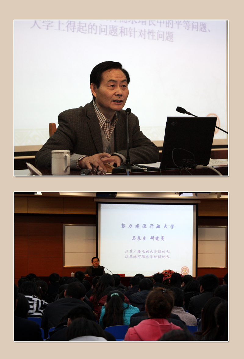 3月10日下午,我校十分荣幸地请到了我国资深远程教育专家、中国教育技术协会常务理事、江苏远程高等教育研究委员会主任、江苏广播电视大学副校长、江苏城市职业学院副院长马良生教授来校,就“努力建设开放大学”作了专题学术报告。