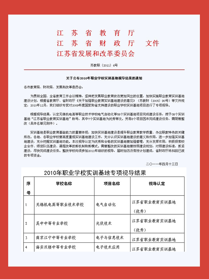 我校“光伏技术”实训基地在省职业学校实训基地专项视导中获“优秀”等次 来源:本站原创 发布时间:2011-04-19 09:23:42 浏览次数: 次 【字体:小 大】 分享到: 【打印正文】 相关内容