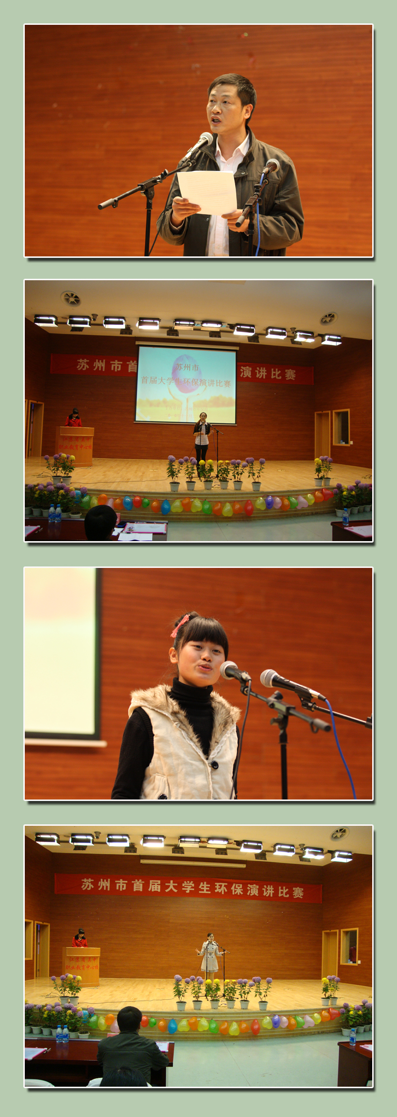 演讲比赛开始前,苏州市环保局宣教处陈建宁处长发表了精彩的致词。市发改委、市总工会、苏州广电总台和苏州日报社的有关领导和专家应邀到场观摩并为获奖的选手颁奖。我校全体学生会干部和环保志愿者近三百人,到场为各位参赛选手加油助威,李梦娜同学主持了本次演讲比赛活动。